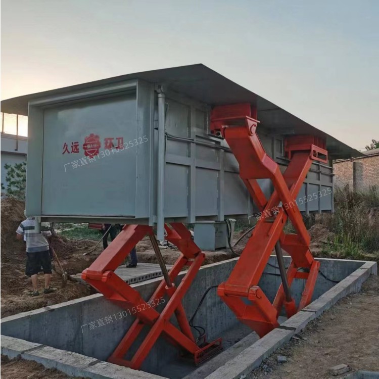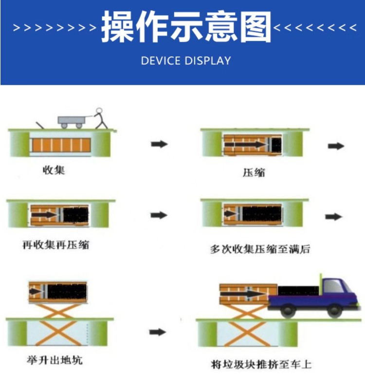 ◇平穩可靠:兩側舉升,剪叉跨度大,升降平穩,無傾斜; ◇淺地坑:地坑深度僅為1.55m,保潔及維修極為方便; ◇高效率:壓實每噸垃圾時間≤10min; ◇全封閉水平壓縮:采用水平壓縮方式,垃圾壓縮密度≥0.86t/m3,垃圾壓縮后體積大大減小,從而大幅度提高轉運車輛裝載量和轉運效率,降低垃圾處理、轉運等費用; ◇動作少,故障率低,整套設備的垃圾壓縮、裝車由三個動作完成,簡單實用,各動作之間安全互鎖,防止操作人員誤操作造成安全事故,安全可靠; ◇垃圾儲存、壓縮及寄存全部在地面以下,地面上沒有垃圾散落,對環境影響較小,環保性好;垃圾壓縮后密度高,水份少,可避免汽車運輸中的垃圾散落、污水滴漏現象,避免二次污染; ◇土建費用低,占地面積小,可以不蓋大型工作間,既節約了投資,也縮短了工期; ◇留有專門的維修窗口,維修保養方便; ◇設有固定式操作和遙控器兩種操作模式,方便實用; ◇自動化程度高,可大幅提高工作效率,降低勞動強度。