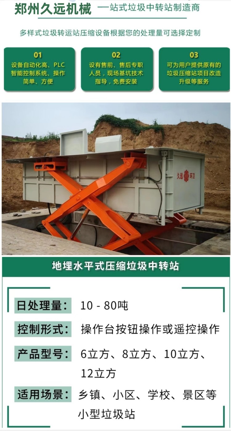 水平式生活垃圾壓縮中轉設備是將垃圾的卸(出)料、壓縮、儲存集合在一起,整體落于地下,利用地下空間將垃圾密閉在箱體內,地面上無垃圾外露現象,壓縮垃圾產生的污水經排污管道直接流入污水井內,然后由污水泵排到城市污水管網,徹底解決了垃圾在收集、儲存、裝運過程中的污染環境、作業效率低等問題。