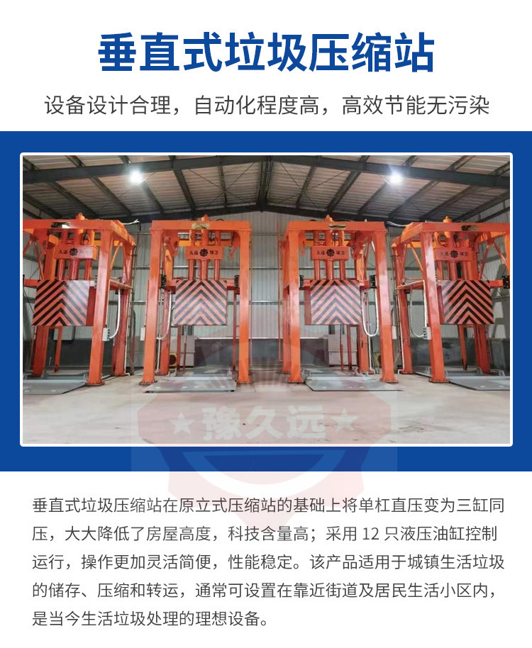 垂直式垃圾壓縮設備在原立式壓縮站的基礎上將單杠直壓變為三缸同壓,大大降低了房屋高度,科技含量高;采用12只液壓油缸控制運行,操作更加靈活簡便,性能穩定。該產品適用于城鎮生活垃圾的儲存、壓縮和轉運,通??稍O置在靠近街道及居民生活小區內,是當今生活垃圾處理的理想設備。